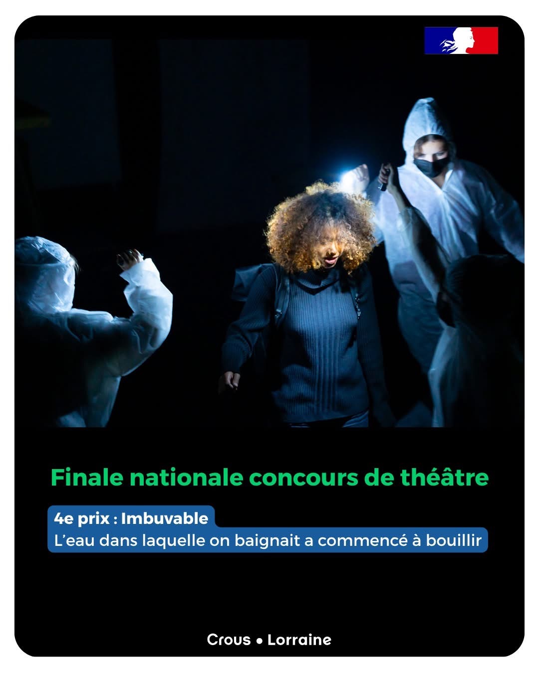 A la découverte des sujets abordés, j’ai été heureuse de constater que les 4 équipes artistiques finalistes, la Compagnie Imbuvable de Toulouse, la Compagnie Dans la Nuit de Montpellier, le Théâtre Universitaire de Dijon et la Cie Maintenant que nous sommes ensemble de Paris, avaient des choses fortes à nous dire, qu’elles utilisaient le théâtre comme un endroit d’engagement pour parler de féminisme, de montée du fascisme, d’emprise, d’écologie, ou encore de résistance. Je me suis immédiatement sentie proche d’elles, impatiente de découvrir leur façon à elles de les dire, d’entendre et voir ce qu’elles avaient à nous partager avec leurs spectacles respectifs : L’eau dans laquelle on baignait a commencé bouillir, C’est pas l’amour, Des oiseaux de fer, Désobéir ou Education Européenne.